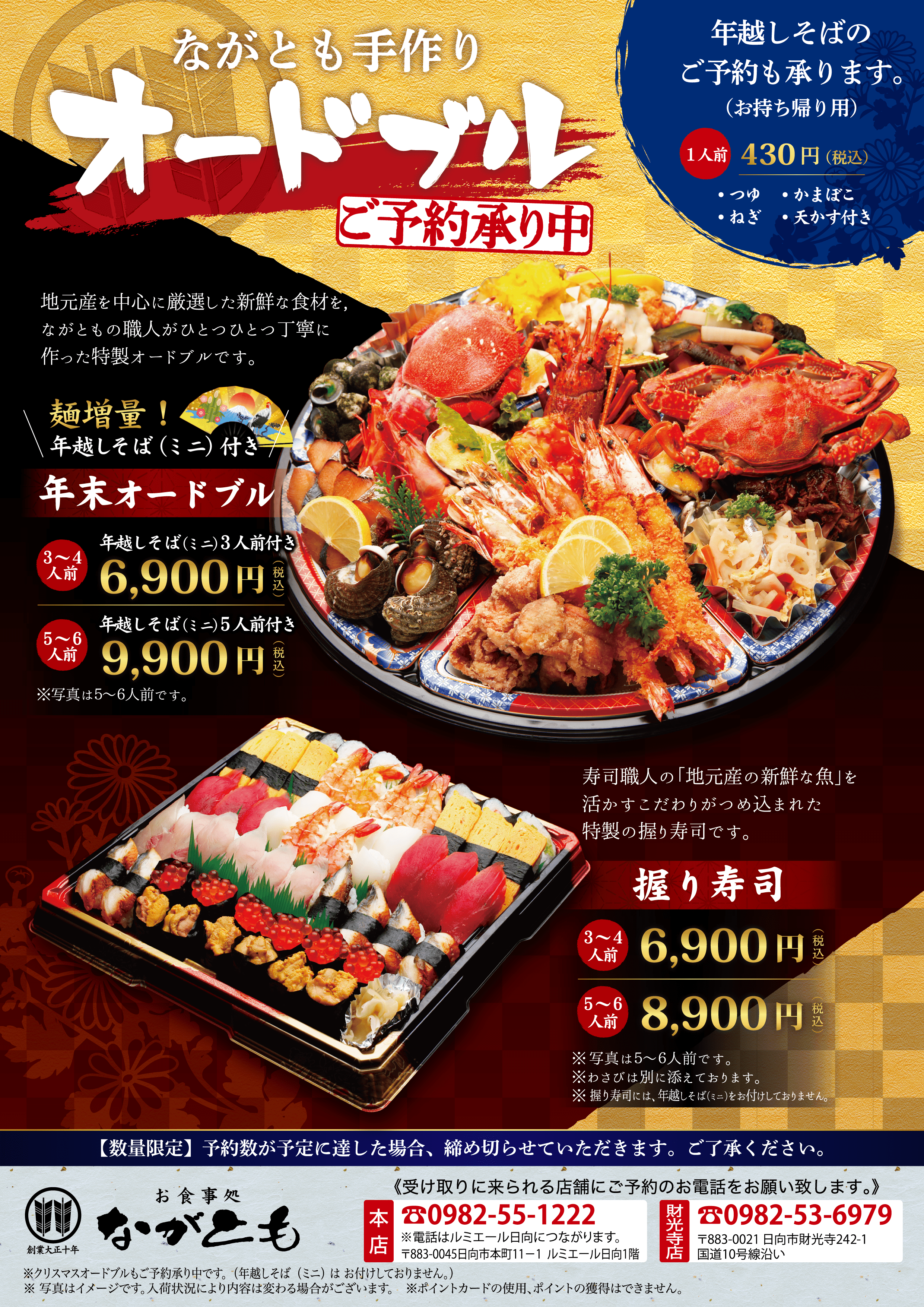 年越しの家族や大切な人との団欒の時間に「ながとも手作りオードブル」や「握り寿司」、「年越しそば」はいかがですか?